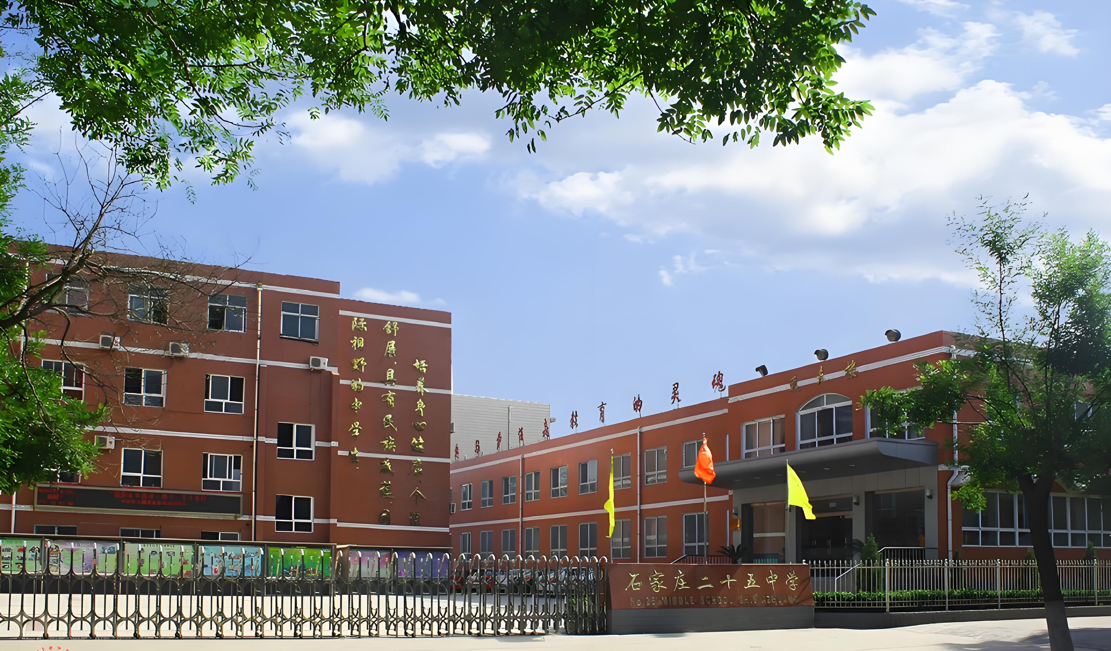 石家庄市第二十五中学位于槐北路274号,1984年建校,校园占地面积23亩,建筑面积13460平方米,是一所集初中、高中、国际教育为一体的多元化完全中学。学校现有在校学生1687人(初中1100人,高中587人),教学班34个(初中20个,高中14个),教职工168人。学校拥有初中楼、高中楼、信息实验楼、省一级图书馆、留学生公寓、主题餐厅等教育教学设施。校园小而精,文化气息浓郁。